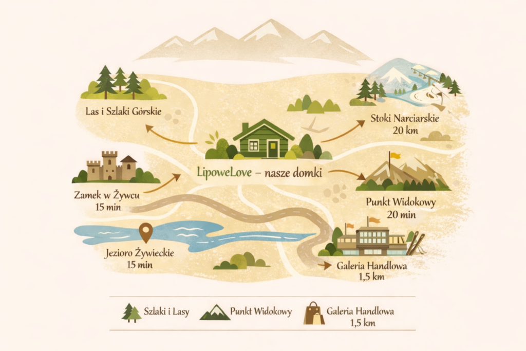 Lipowa i jej okolice to idealne miejsce dla miłośników natury, górskich widoków i aktywnego wypoczynku. W pobliżu znajdują się malownicze szlaki Beskidu Śląskiego i Żywieckiego, trasy rowerowe, miejsca spacerowe oraz liczne atrakcje dla rodzin. To doskonała baza wypadowa na wycieczki, relaks na łonie natury i odkrywanie lokalnych ciekawostek regionu.